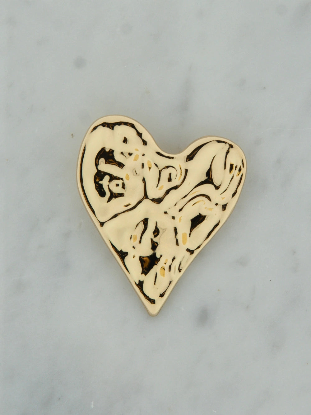 Een hart met karakter — letterlijk. Deze gouden broche met reliëfstructuur is allesbehalve basic. Voeg ‘m toe aan je jas, trui of tas en geef elke look een artistieke touch.