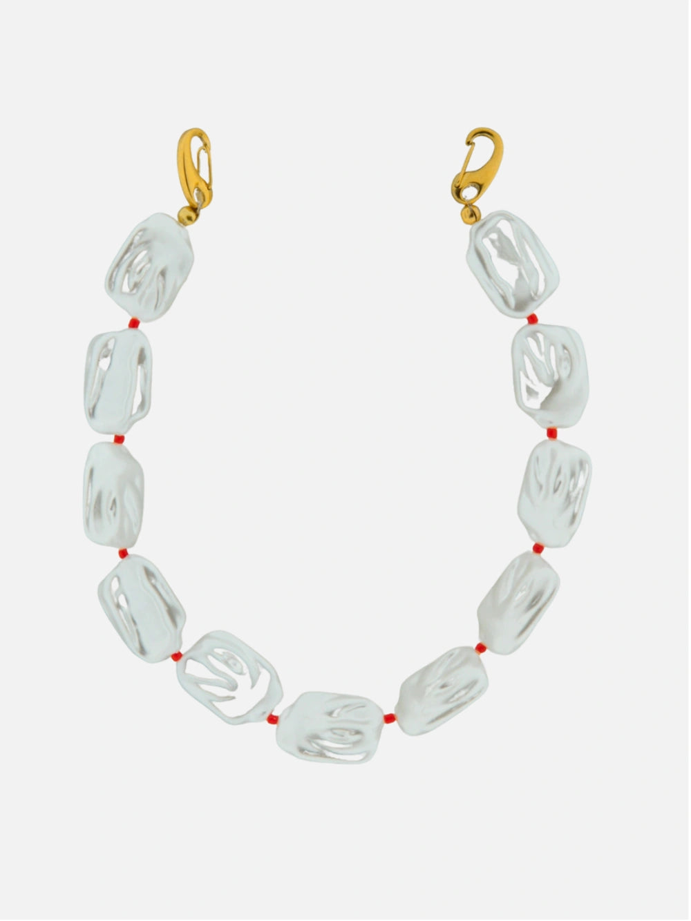 Elegantie met een twist: deze witte platte parels worden onderbroken door kleine rode kralen voor een opvallende maar minimal vibe.