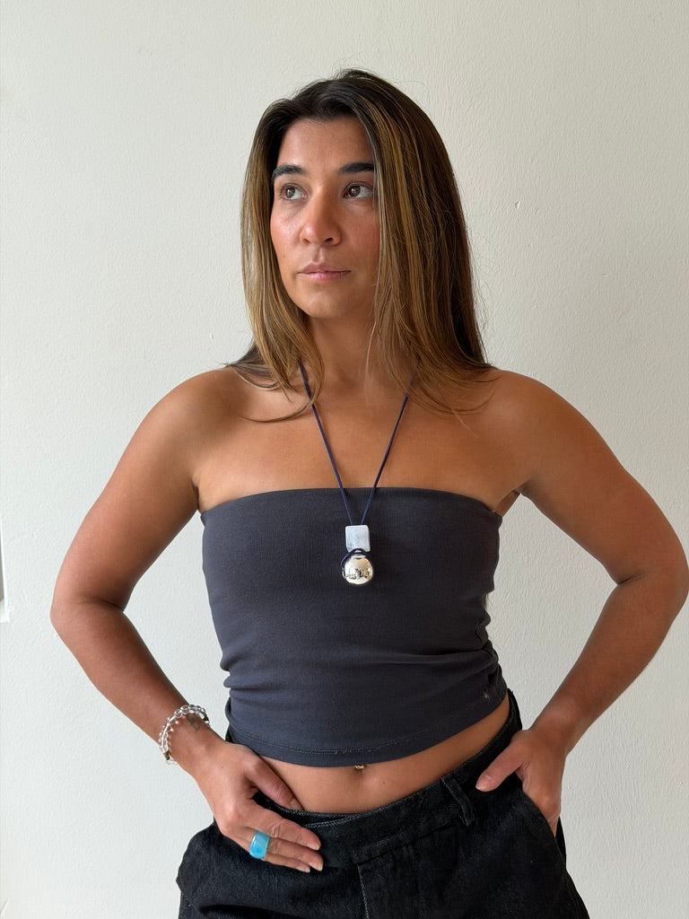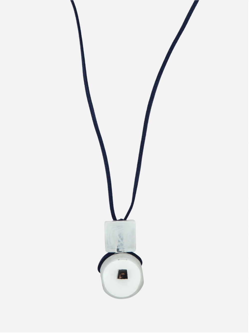Deze ketting heeft een donkerblauw koord met kralen in verschillende vormen. De lichte tinten geven een subtiel effect dat mooi afsteekt tegen het koord.
